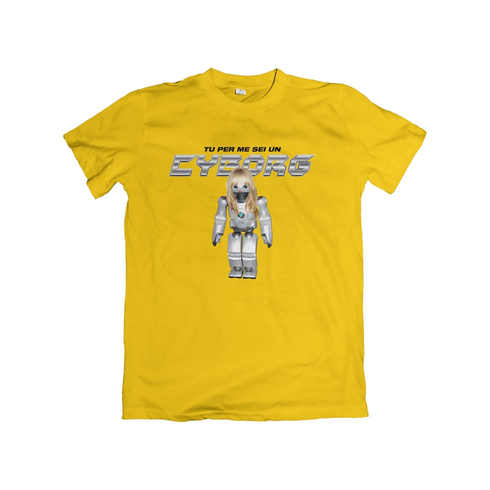 Maglietta gialla contenente la rappresentazione di un robottino con i capelli biondi e la frase "Tu per me sei un Cyborg", ispirata al brano "Cyborg".